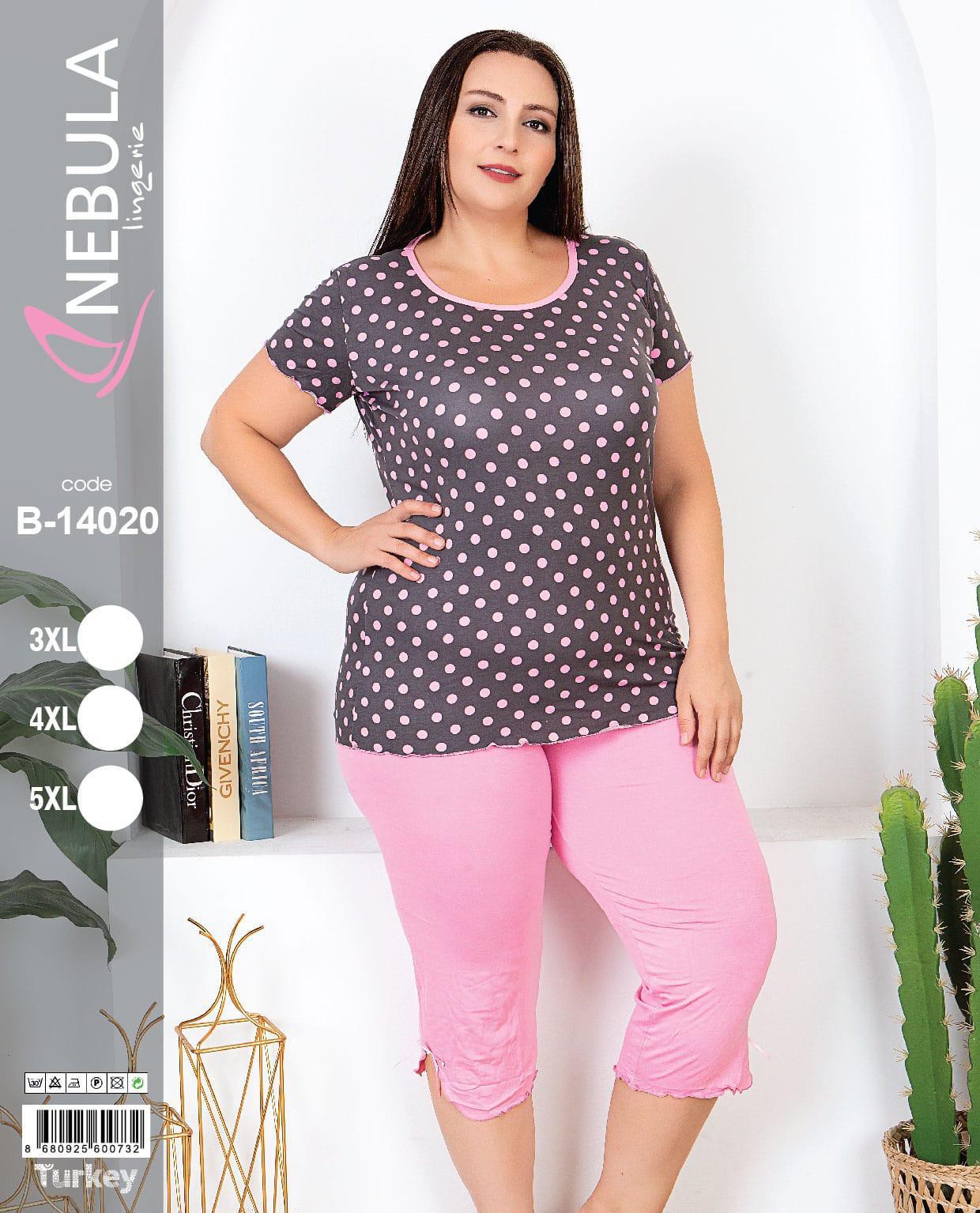 PIŻAMA DAMSKA KRÓTKI RĘKAW 3/4 SPODNIE 3XL-5XL B- 14020 to wygodna i stylowa piżama damska, idealna na ciepłe letnie noce. Wykonana z wysokiej jakości materiałów, zapewniających komfort i swobodę ruchów. Piżama składa się z koszulki z krótkim rękawem oraz spodni w długości 3/4. Dostępna w rozmiarach 3XL-5XL.