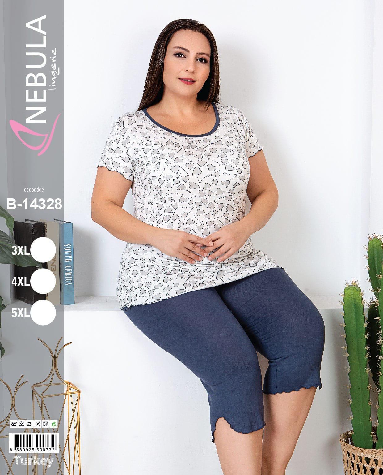 PIŻAMA DAMSKA KRÓTKI REKAW 3/4 SPODNIE WISKOZA 3XL-5XL B-14328 to wygodna i stylowa piżama damska, idealna na ciepłe letnie noce. Składa się z koszulki z krótkim rękawem oraz spodni 3/4. Dostępna w rozmiarach od 3XL do 5XL.