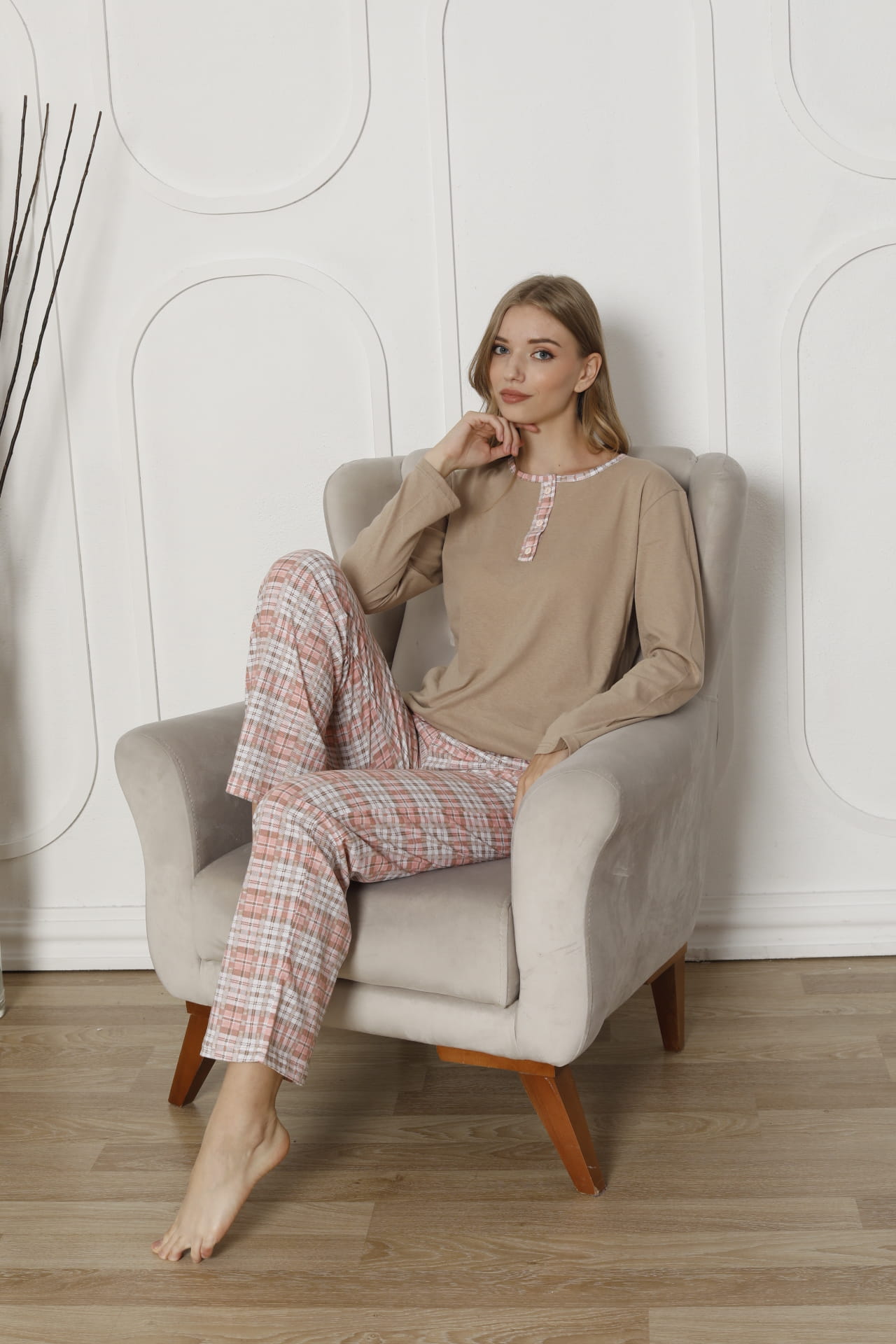 Ta piżama damska to idealny wybór dla kobiet poszukujących wygody i stylu. Wykonana z wysokiej jakości bawełny, zapewniającej komfort noszenia i miękkość na skórze. Piżama składa się z bluzki rozpinanej na 3 guziki z długim rękawem i długich spodni, które doskonale dopasowują się do sylwetki. Dostępne są aż 4 kolory piżam.
