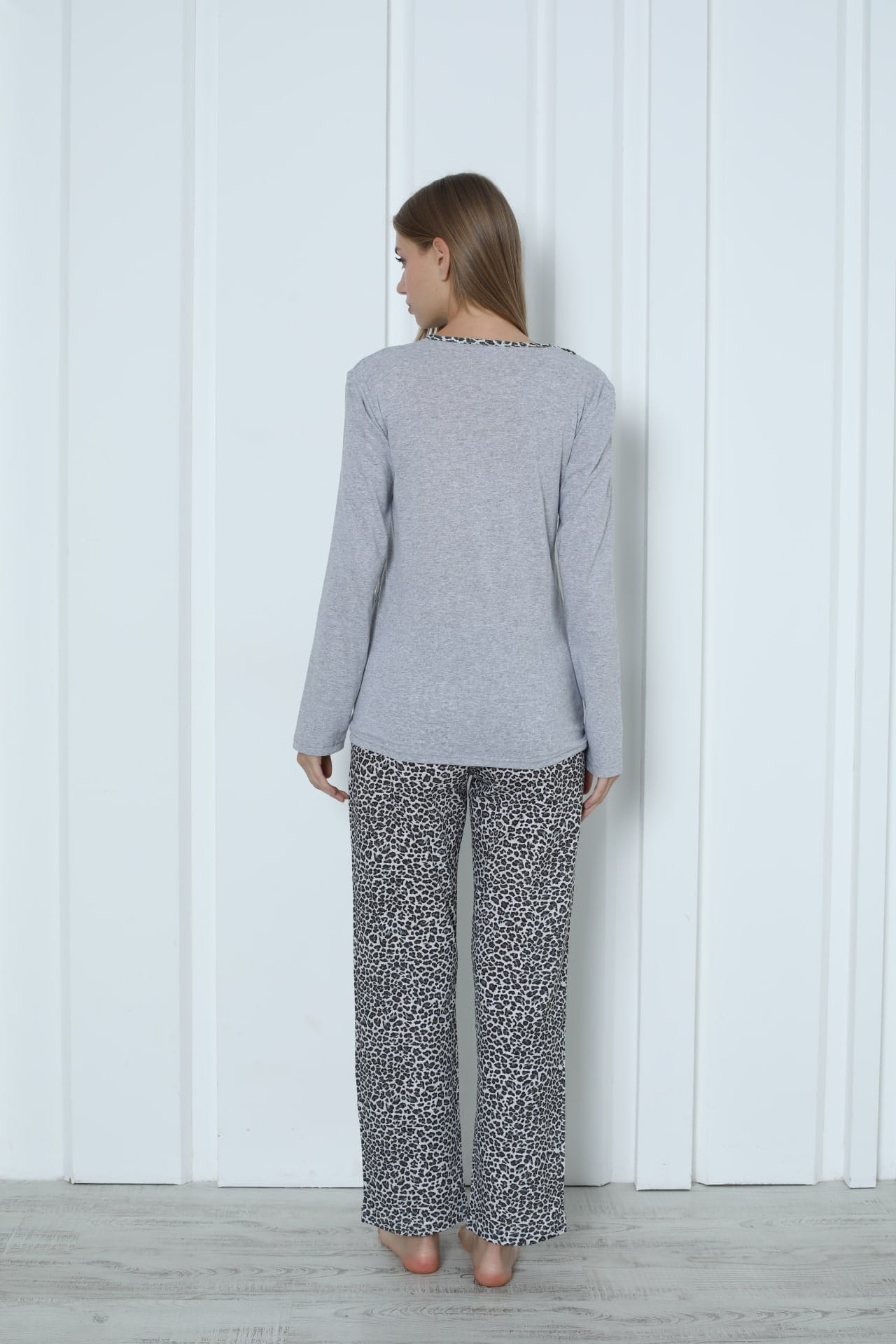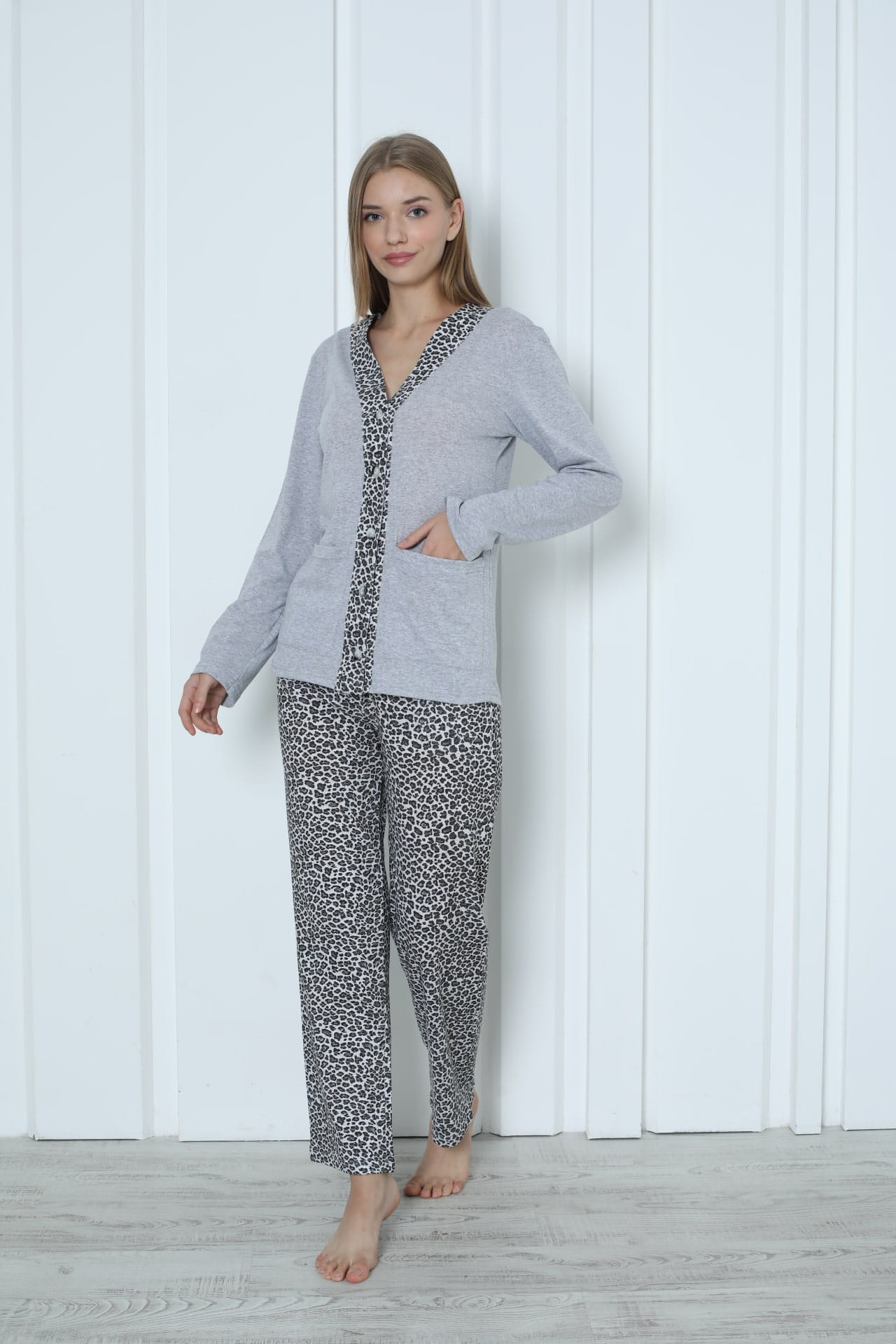 Ta piżama damska to idealny wybór dla kobiet poszukujących wygody i stylu. Wykonana z wysokiej jakości bawełny, zapewniającej komfort noszenia i miękkość na skórze. Piżama składa się z koszuli rozpinanej z długim rękawem i długich spodni, które doskonale dopasowują się do sylwetki. Dostępne jest w kolorze szarym.