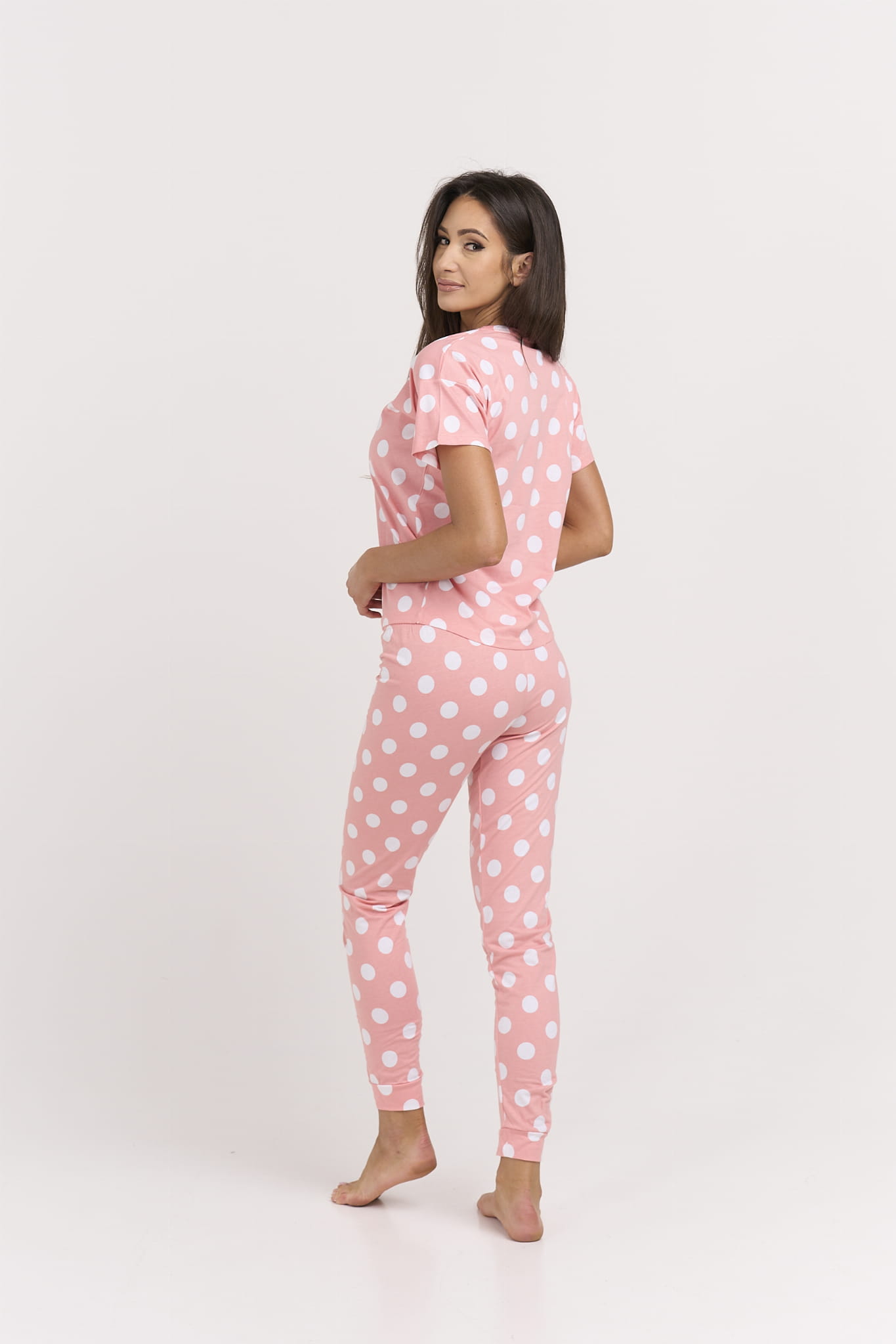 Ta piżama posiada krój, który doskonale dopasowuje się do kobiecej sylwetki, podkreślając atuty figury. Krótkie rękawy i długie spodnie zapewniają optymalną temperaturę ciała przez całą noc.