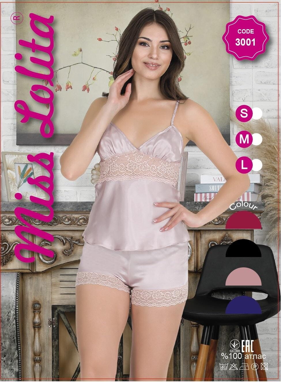 SATYNOWA PIŻAMA DAMSKA WĄSKIE RAMIĄCZKA Z SZORTAMI S-L 3001