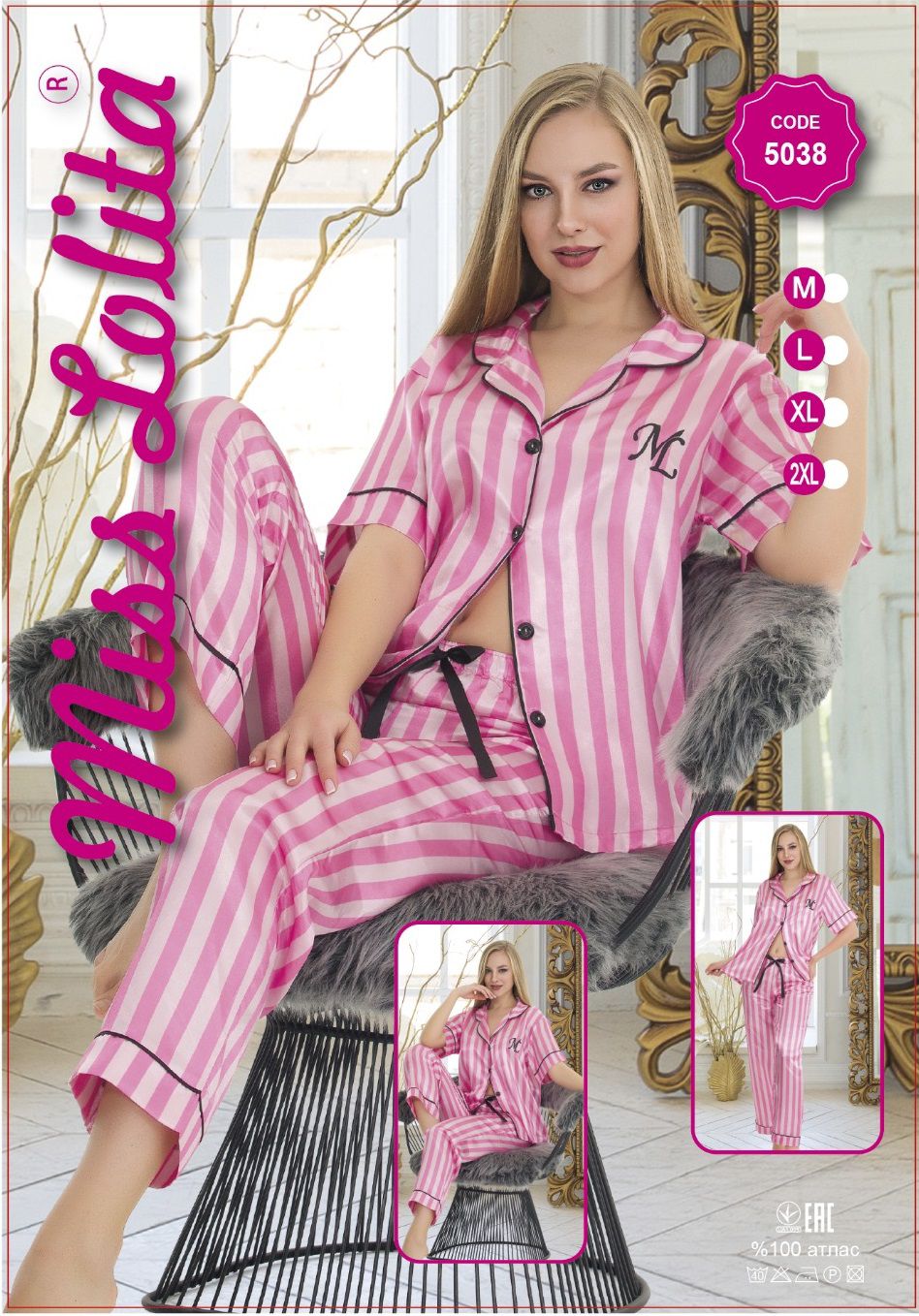 Skład piżamki to 100% satyna, która jest miękka i przyjemna w dotyku. Dzięki temu materiałowi piżamka zapewnia komfort podczas noszenia i doskonale dopasowuje się do ciała.