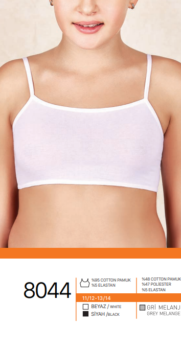 Ten komplet bielizny hurtowy jest idealny dla dziewcząt w wieku 11-14 lat. Dostępne rozmiary to 11/12 i 13/14. Możesz wybrać spośród trzech kolorów: białego, czarnego i szarego.